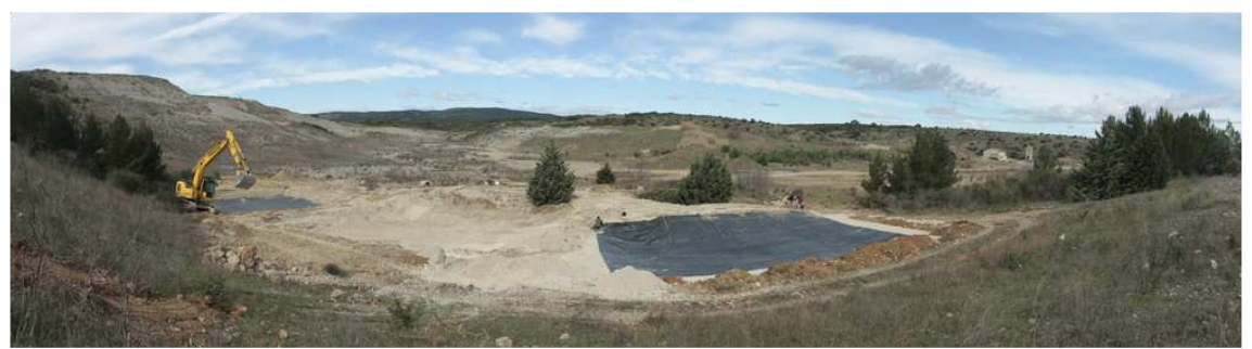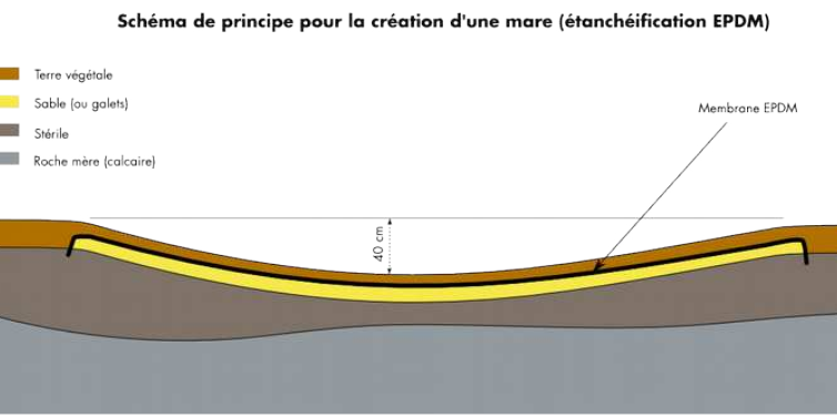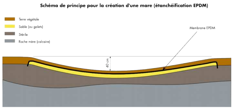 Il a été choisi d’utiliser une membrane EPDM (caoutchouc de synthèse) afin d’étanchéifier le lit de sable initialement présent (constituant un substrat hyperfiltrant). La membrane caoutchouc a été recouverte avec le sable du site en espérant qu’il la protège contre le poinçonnement, et pour rendre possible la colonisation des mares par la végétation. Afin d’accélérer ce processus, le fond des mares temporaires impactées par les aménagements futurs a été prélevé et réutilisé au fond des mares nouvellement créées pour ensemencer les nouvelles mares avec le stock de graines du site (présence de characées).