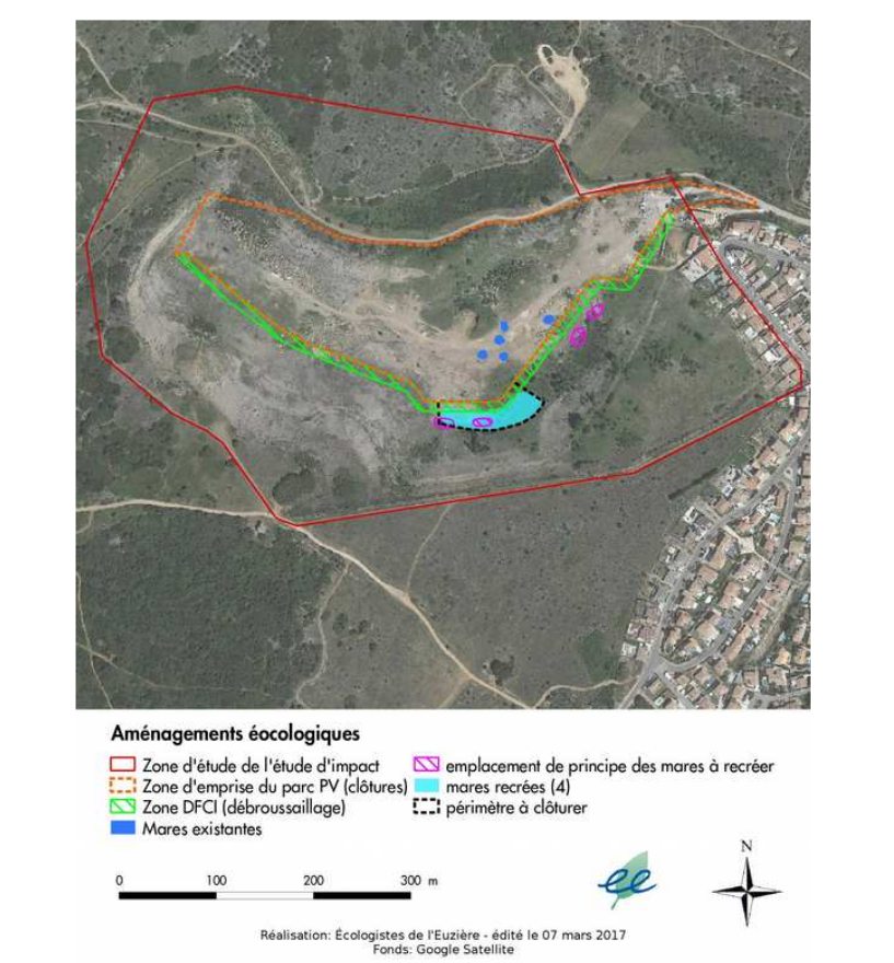 Dans la démarche de réduction des impacts environnementaux deux mares temporaires totalisant une surface au sol de 800 m² ont été créées en 2017 dans la carrière accueillant le projet de centrale photovoltaïque. Elles constituent la mesure de réduction MR3 de l’étude d’impact de l’aménagement de la carrière.