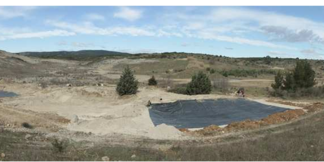 l’EPDM cependant est une méthode efficace et durable pour imperméabiliser une mare, avec environ 20 ans de non-sensibilité aux UV. Cependant la membrane est sensible au poinçonnement et aux lacérations. Sur le site Cournonsec, en l’absence de protection contre les sangliers (dallage), une des membrane a été lacérée par endroit par les sangliers. La maîtrise d’ouvrage a pris un risque en ne protégeant pas davantage les membranes EPDM contre la lacération par les sangliers. Les caractéristiques géotechniques du site (sable naturellement compact) ont toutefois limité les perforations, constatées en partie haute des mares. Les éventuelles fuites n’impactent pas significativement leur niveau d’eau. Le chapelet de mares déplacées semble fonctionner correctement puisque ces aménagements gardent l’eau plusieurs mois de l’année.