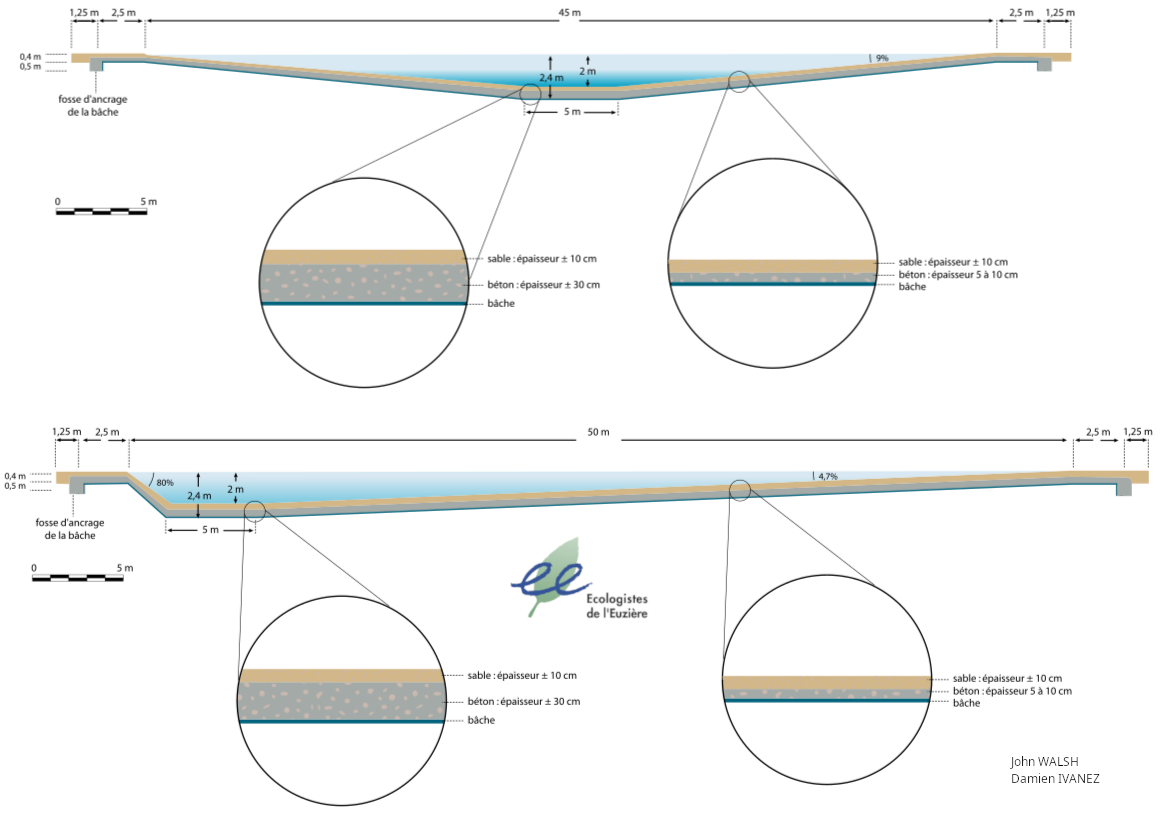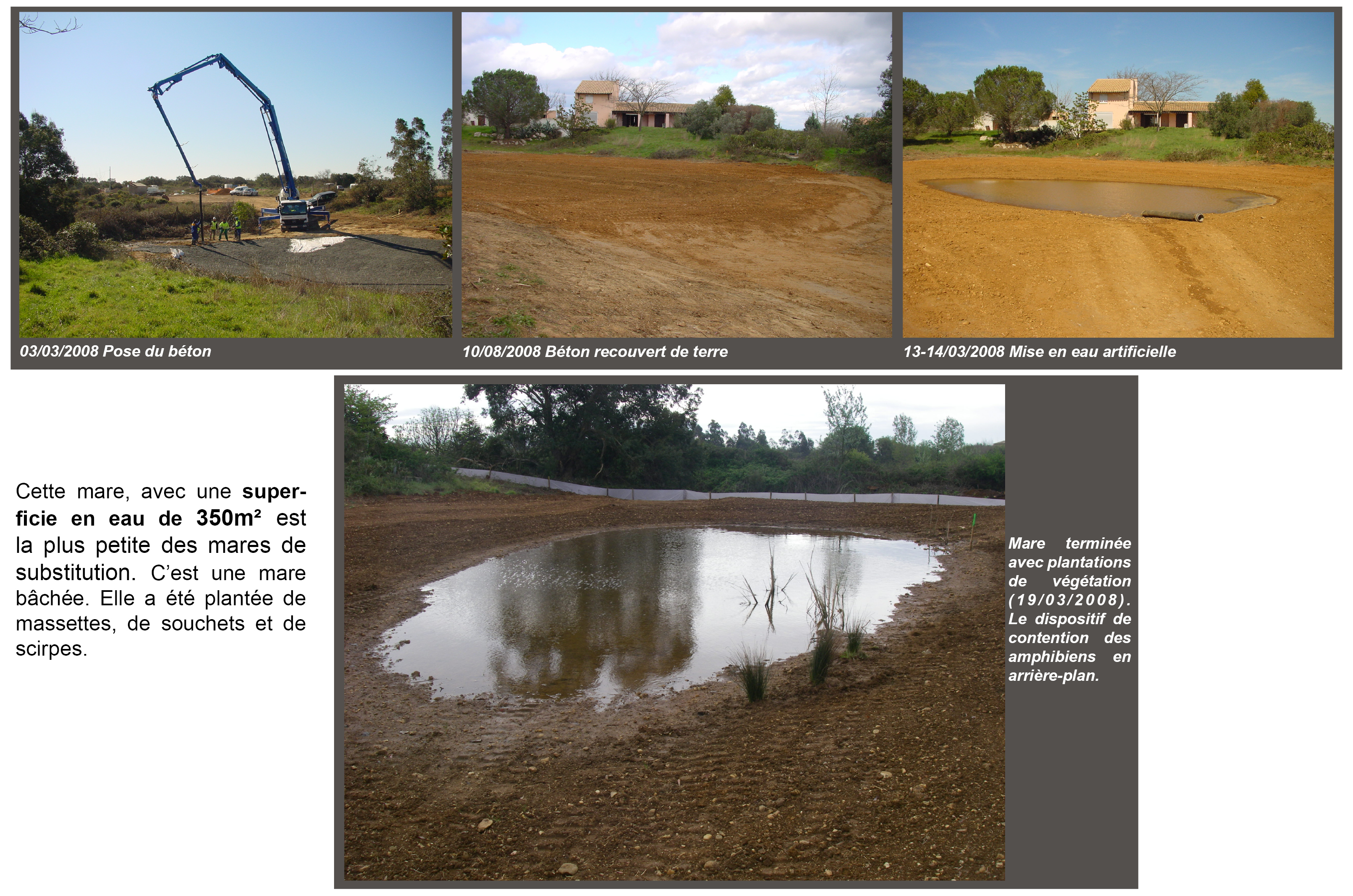 L’imperméabilisation à l’aide d’une bâche protégée par du béton est une technique qui s’est avérée efficace au regard de l’état actuel des mares ainsi que tout au long du suivi.