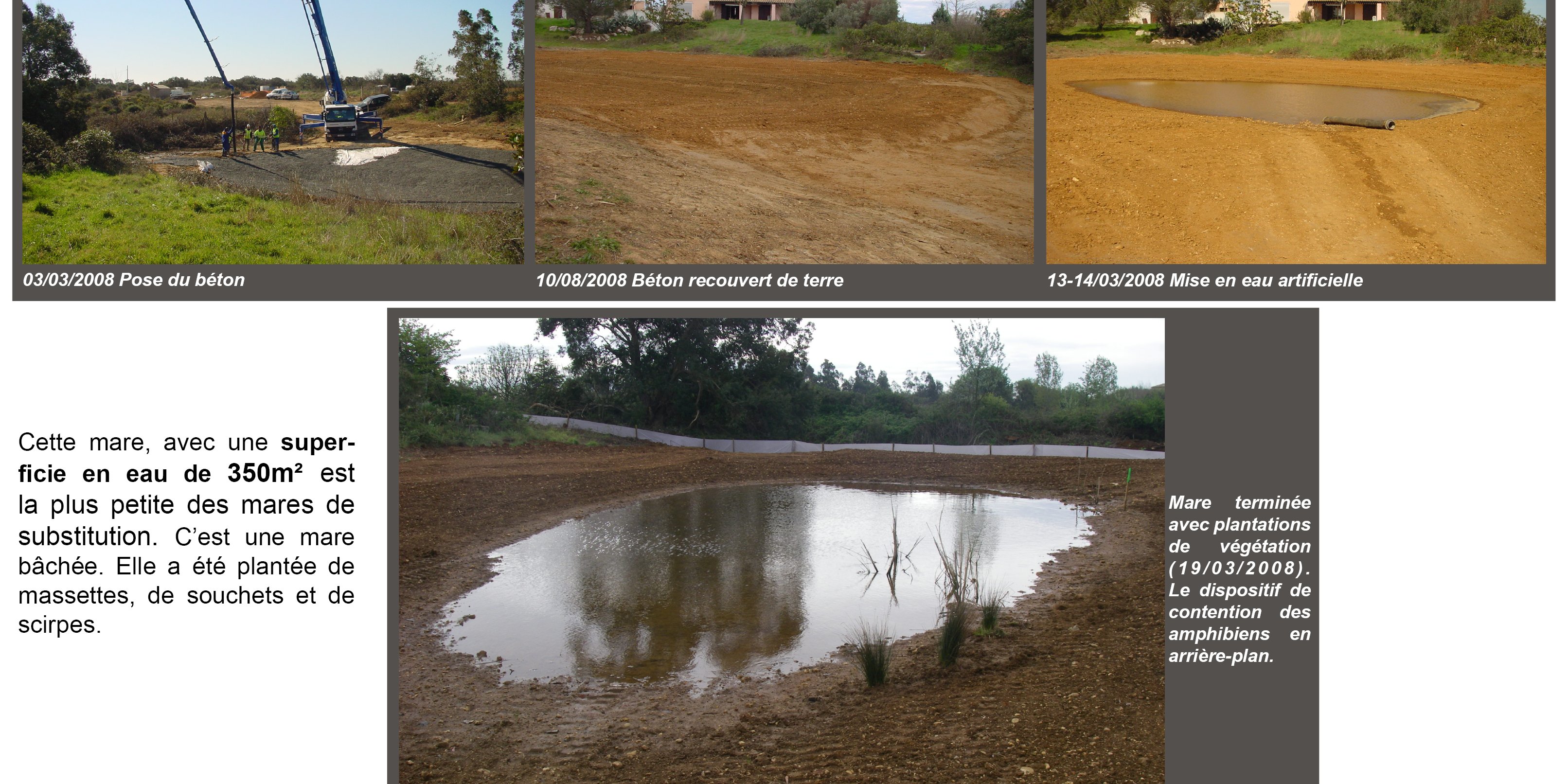 Suite à l’étude d’impacts environnementaux réalisée par l’association Les Écologistes de l’Euzière, une mesure de transfert des amphibiens et des reptiles présents sur ces sites jusqu’aux nouveaux habitats de substitutions suivi d’une période de suivi a été réalisée. Pour ce faire, 4 nouvelles mares ont été créées (4 700 m²). Le substrat sur lequel les mares ont été créées est un sol acide de type maquis, plusieurs méthodes d’imperméabilisation ont été testées, notamment le surcreusement sans imperméabilisation et l’imperméabilisation à l’aide d’une bâche protégée par une couche de béton.