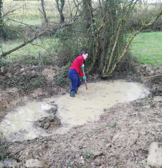 2ème mare : débroussaillage et bûcheronnage sur une berge de la mare (2026), bûcheronnage et retrait des arbres tombés dans la mare (2026), désenvasement manuel lors d’un chantier bénévole (en 2025)