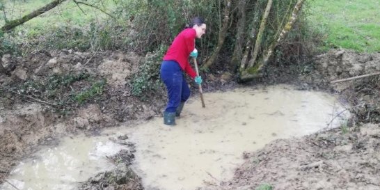 1ère mare : débroussaillage sur une berge de la mare (2024), désenvasement manuel lors de deux chantiers bénévoles (en 2024 et en 2025) puis mécanique (par l’agriculteur en 2025) sur un 1 mètre de profondeur